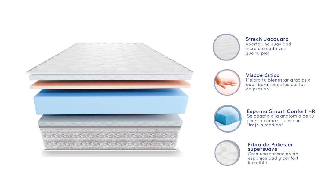Espuma Smart Confort: Melhora o seu bem-estar ao liberar todos os pontos de pressão e proporciona uma suavidade incrível cada vez que a sua pele toca